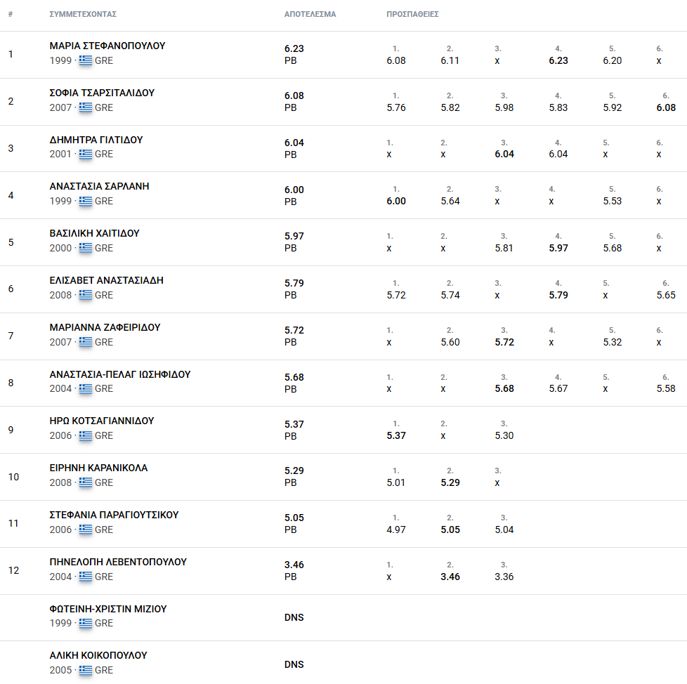 Η Μαρία Στεφανοπούλου έκανε έναν σταθερό αγώνα με άλματα πάνω από τα 6μ και καλύτερο στο 6.23μ, ένα εκατοστό πίσω από το περσινό της ρεκόρ στον κλειστό, το 6.24μ. Η αθλήτρια του Θωμά Πάντου που έχει 6.38μ (0.3) στον ανοιχτό στίβο από πέρυσι βελτιώθηκε αρκετά σε σχέση με την πρεμιέρα της (6.06μ) στις αρχές Ιανουαρίου και θα επιδιώξει να μείνει σταθερή σε μεγάλα άλματα.