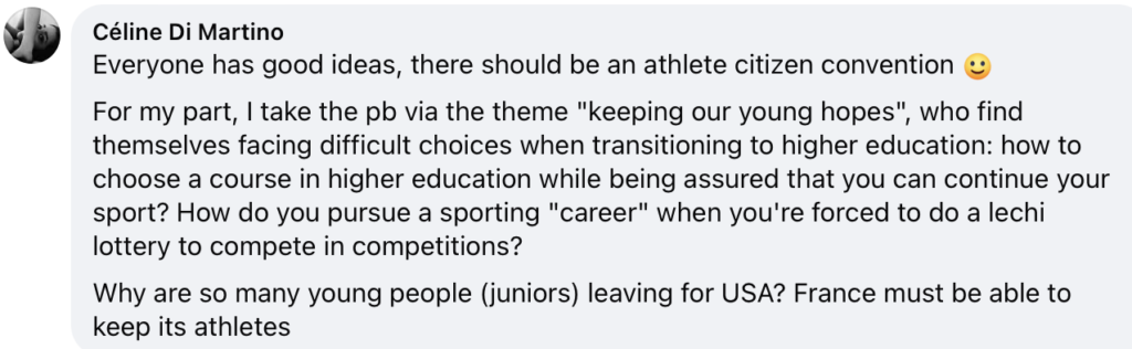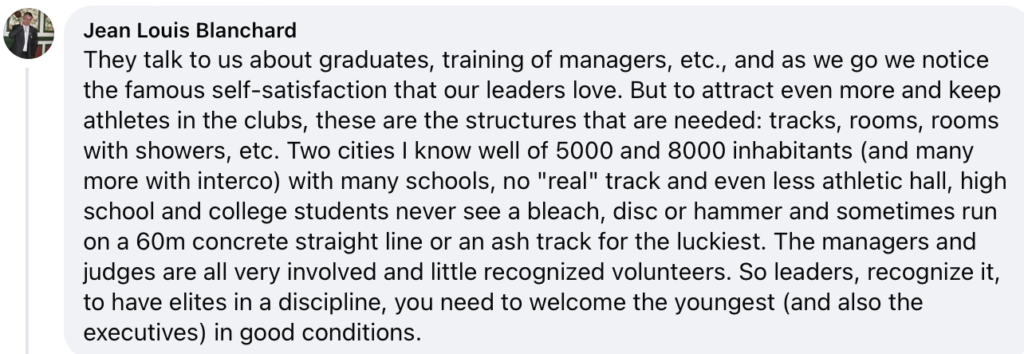 Την τελευταία άποψη συμμερίζονται και αρκετοί από τους Γάλλους χρήστες των social media, οι οποίοι δεν παρέλειψαν να εκφράσουν την γνώμη τους για την κατάσταση κάνοντας σχόλια του τύπου: «Ωραίοι όλοι αυτοί οι αριθμοί, αλλά πόσοι αθλητές υψηλού επιπέδου υπάρχουν;», ενώ ήταν και αυτοί που ανέπτυξαν περαιτέρω τα προβλήματα του γαλλικού στίβου, αναφερόμενοι στην έλλειψη υποστήριξης στους αθλητές που θέλουν να συνεχίσουν τις σπουδές τους στην τριτοβάθμια εκπαίδευση, αλλά και στην έλλειψη υποδομών.