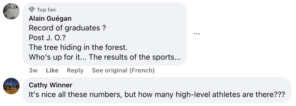 Την τελευταία άποψη συμμερίζονται και αρκετοί από τους Γάλλους χρήστες των social media, οι οποίοι δεν παρέλειψαν να εκφράσουν την γνώμη τους για την κατάσταση κάνοντας σχόλια του τύπου: «Ωραίοι όλοι αυτοί οι αριθμοί, αλλά πόσοι αθλητές υψηλού επιπέδου υπάρχουν;», ενώ ήταν και αυτοί που ανέπτυξαν περαιτέρω τα προβλήματα του γαλλικού στίβου, αναφερόμενοι στην έλλειψη υποστήριξης στους αθλητές που θέλουν να συνεχίσουν τις σπουδές τους στην τριτοβάθμια εκπαίδευση, αλλά και στην έλλειψη υποδομών.