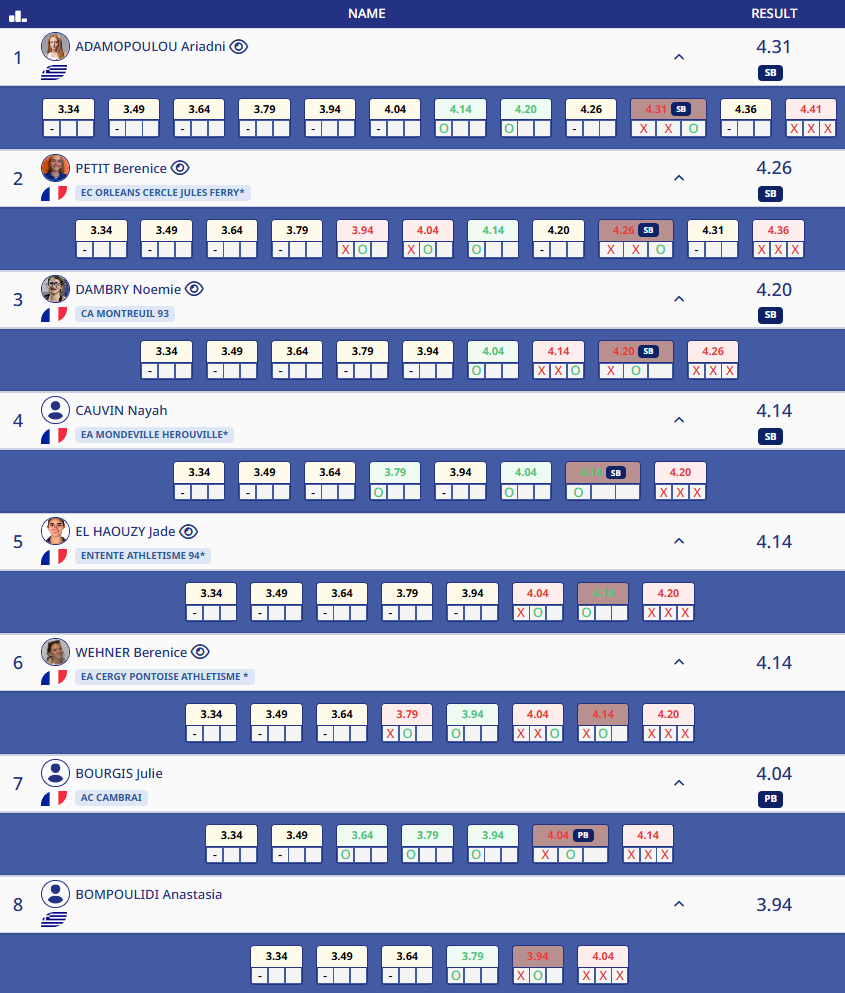 Την Ελληνίδα ακολούθησε η Γαλλίδα Μπερενίς Πετί που έφτασε μέχρι το 4.26μ και είχε τρεις άκυρες στο 4.36μ, ενώ τρίτη με 4.20μ ήταν η επίσης Γαλλίδα Νοεμί Νταμπρί. Την όγδοη θέση κατέκτησε η δεύτερη Ελληνίδα, η 17χρονη Αναστασία Μπουμπουλίδη, με 3.94μ και με τρεις άκυρες στο 4.04μ. Η πρωταθλήτρια Ευρώπης κορασίδων του 2024 μαζεύει εμπειρία από διεθνείς αγώνες ώστε να την αξιοποιήσει στο μέλλον.
