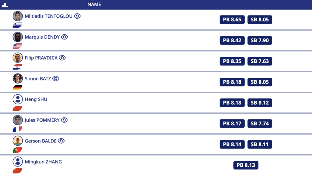 Την κορυφαία φετινή επίδοση από τους συμμετέχοντες έχει ο Κινέζος Χενγκ Σου με 8.12μ, ενώ ικανός αντίπαλος θα είναι και ο Πορτογάλος Γκέρσον Μπάλντε, που έχει φτάσει φέτος στο 8.11μ.