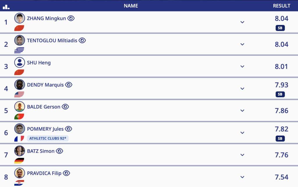 Ο Τεντόγλου είχε καλύτερο άλμα στα 8.04μ, πολύ κοντά στο 8.05μ που είχε σημειώσει στην πρεμιέρα του στο Βελιγράδι, αλλά μακριά από τις επιδόσεις που τον έχουμε συνηθίσει. Ο χρυσός Ολυμπιονίκης του Παρισιού ξεκίνησε τον αγώνα του με άλμα στα 7.78μ, συνέχισε με 7.98μ και 7.82μ, ενώ στην τέταρτη προσπάθεια έφτασε για πρώτη φορά τα 8.00μ. Ακολούθησε μια άκυρη και φυσικά το 8.04μ που του χάρισε τη δεύτερη θέση. Νικητής του αγώνα αναδείχθηκε ο Κινέζος Μίνγκουν Ζανγκ, ο οποίος πέτυχε ακριβώς την ίδια επίδοση με τον Έλληνα πρωταθλητή στον πρώτο του αγώνα για τη φετινή σεζόν, αλλά είχε δεύτερη καλύτερη στα 8.03μ σε αντίθεση με το 8.00μ του Τεντόγλου.