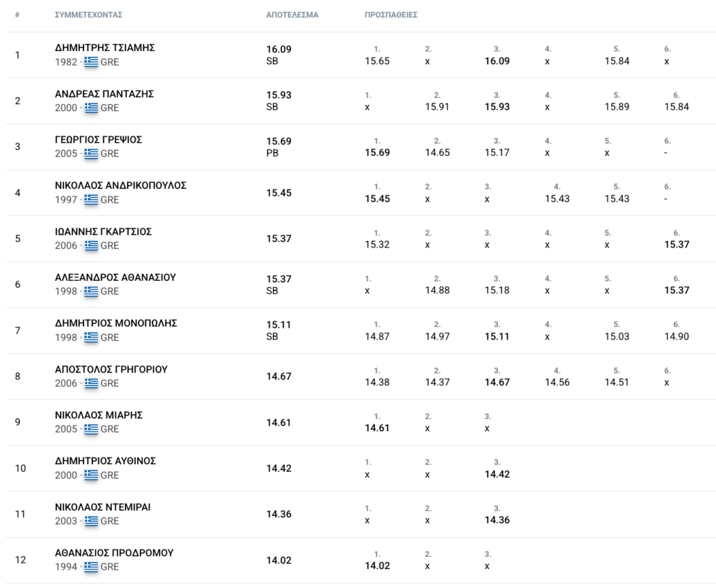 Ο Καρδιτσιώτης αθλητής ήταν πρώτος μέχρι την 5η προσπάθεια με 16.09μ. Στην 6η προσπάθεια ο Νίκος Ανδρικόπουλος έκανε άλμα που μετρήθηκε στο 16.20μ αλλά ήταν εξώφθαλμο ότι δεν ανταποκρινόταν στην πραγματικότητα, με αποτέλεσμα να γίνει ένσταση και από τον ΟΣΦΠ για τον Τσιάμη και από τον ΑΟ Μεγάρων για τον Πανταζή που ακολουθούσε στην κατάταξη με 15.93μ.