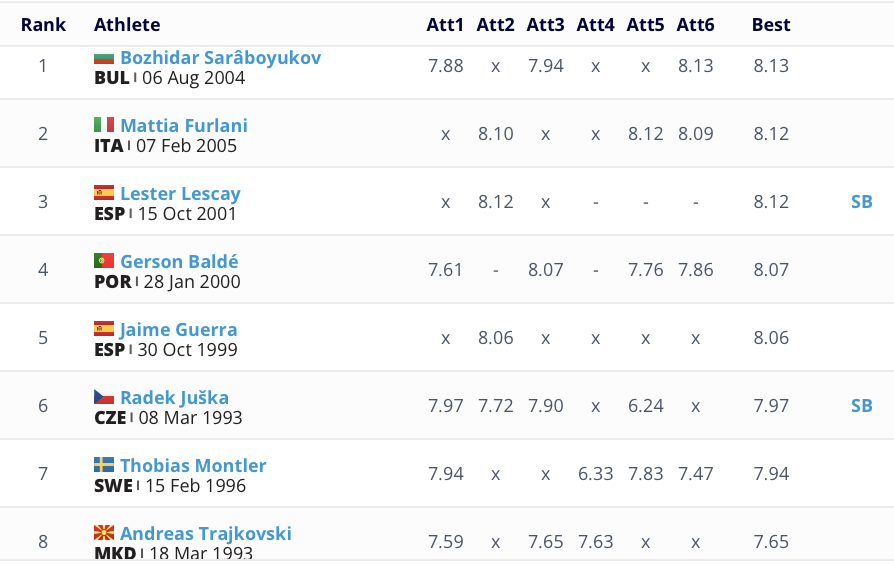 Την ευκαιρία εκμεταλλεύτηκε ο Βούλγαρος Σαραμπογιούκοβ, ο οποίος στην τελευταία προσπάθεια ξεπέρασε κατά ένα εκατοστό το 8.12μ του Φουρλάνι, με άλμα στα 8.13μ και πέρασε από έκτος, πρώτος, την κατάλληλη στιγμή του αγώνα. Ο Ιταλός δεν κατάφερε να απαντήσει και έτσι έμεινε δεύτερος, με τον Ισπανό Λέστερ Λεσκάι να ακολουθεί στην τρίτη θέση με την ίδια ακριβώς επίδοση, αλλά χωρίς άλλη έγκυρη προσπάθεια.