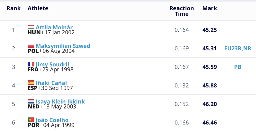 Ο Βάρχολμ δεν ήταν εκεί για να υπερασπιστεί τον τίτλο του, και έτσι ο χάλκινος στο Ευρωπαϊκό Κ23 του 2023, Μόλναρ, εκμεταλλεύτηκε την ευκαιρία για να ανέβει στην κορυφή της Ευρώπης στην κατηγορία των ανδρών για πρώτη φορά. Ο 21χρονος Σβεντ έδειξε έτοιμος να πρωταγωνιστήσει και στην κατηγορία των ανδρών, αφού ολοκλήρωσε τον αγώνα του δεύτερος με μικρή διαφορά από τον προπορευόμενο Μόλναρ με 45.31 έναντι 45.25. Το προηγούμενο ρεκόρ Ευρώπης άνηκε στον Σουηδό, χάλκινο στην Κωνσταντινούπολη το 2023, Καρλ Μπένγκτστρομ με 45.33. Η τριάδα συμπληρώθηκε από τον Γάλλο Τζίμι Σουντρίλ με 45.59.