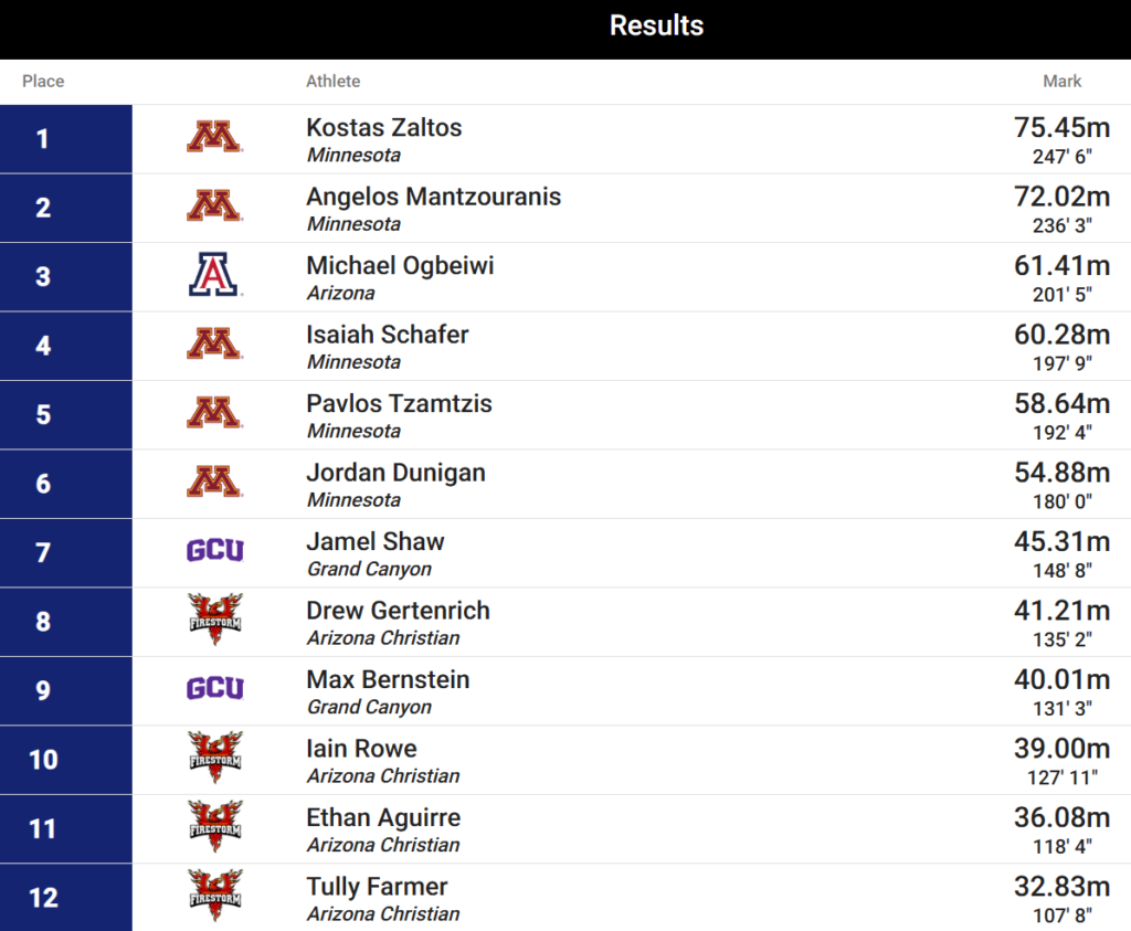Ο Κώστας Ζάλτος έστειλε τη σφύρα στα 75.45μ κατά τη διάρκεια του μίτινγκ Arizona Spring Break Fiesta και πέτυχε την τρίτη καλύτερη επίδοση της καριέρας του, πίσω από το ατομικό του, το 76.33μ, και το περσινό του ρεκόρ (75.81μ). Επιπλέον, αυτή είναι η μακρύτερη βολή που έχει σημειώσει ο Έλληνας πρωταθλητής σε season opener από την αρχή της καριέρας του. Μετά από μια άκρως επιτυχημένη σεζόν στον κλειστό στην ρίψη οργάνου και μια θέση στο top10 του ΝCAA ο Ζάλτος είναι έτοιμος να διεκδικήσει μεγάλες βολές στη σφυροβολία στην αρκετά εκτεταμένη σεζόν του ανοιχτού.