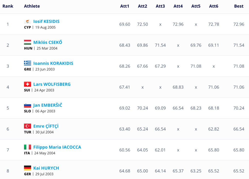 Ο Κεσίδης έκανε έναν σταθερότατο αγώνα με 4/6 βολές πάνω από το προηγούμενο ρεκόρ του των 72.23μ και με καλύτερη στα 72.96μ πήρε τη νίκη στον αγώνα μέσα στην έδρα του στην πρώτη του χρονιά στην κατηγορία των νέων. Ακολούθησε ο Ούγγρος Μίκλος Σέκο που έκανε επίσης ατομικό ρεκόρ με 71.54μ στην τρίτη του βολή, ενώ ο Κορακίδης βρήκε τον εαυτό του στην 5η βολή με φετνό ρεκόρ 71.08μ και εξασφάλισε το χάλκινο. Ο Ελβετός Λαρς Βόλφισμπεργκ απείλησε στην τελευταία του βολή τον Έλληνα με καλή βολή, αλλά μετρήθηκε 2 εκατοστά πιο πίσω, στα 71.06μ.
