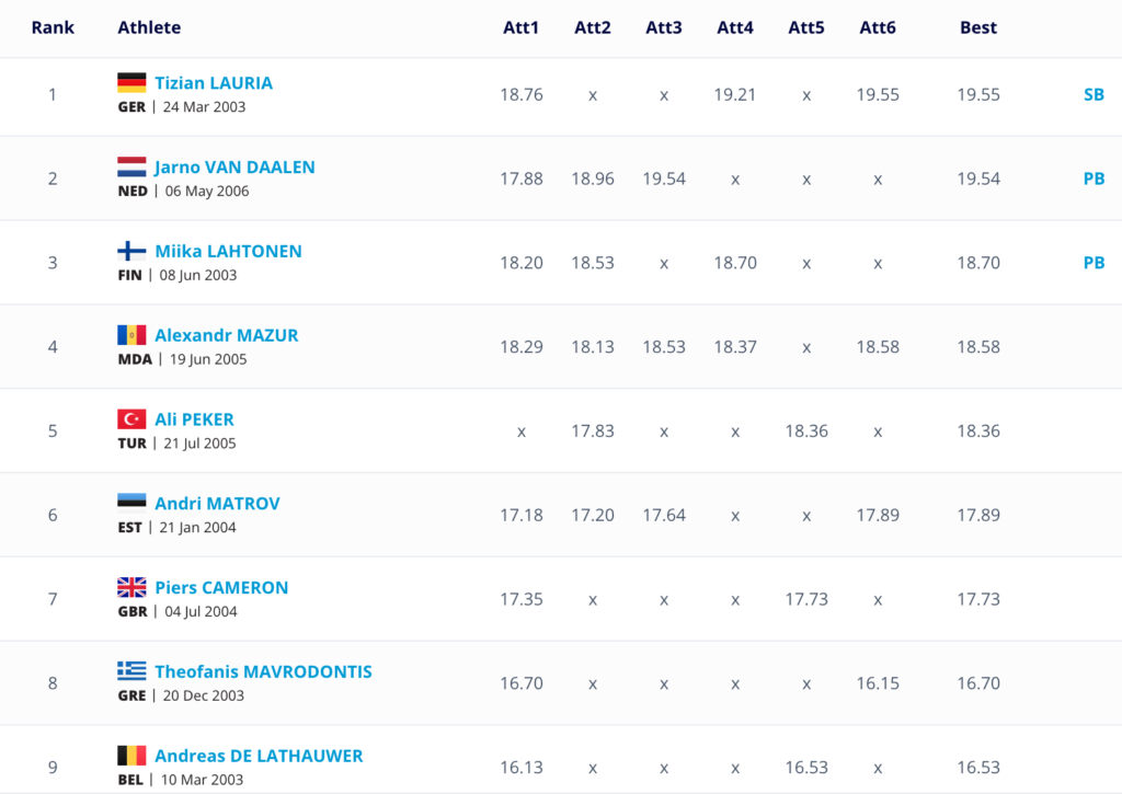 Ο Μαυροδόντης έστειλε στην πρώτη του προσπάθεια τη σφαίρα στα 16.70μ και στη συνέχεια είχε 4 άκυρες και μία τελευταία προσπάθεια στα 16.15μ. Ο αθλητής του Ανέστη Καλτζίδη δεν μπόρεσε να εφαρμόσει την τεχνική που ήθελε για να ρίξει πιο μακριά από το ατομκό ρεκόρ των 17.60μ που έχει ρίξει φέτος στον κλειστό. Κατέκτησε την 8η θέση στο Α γκρουπ και την 9η στη συνολική κατάταξη της σφαιροβολίας νέων ανδρών (Κ23).