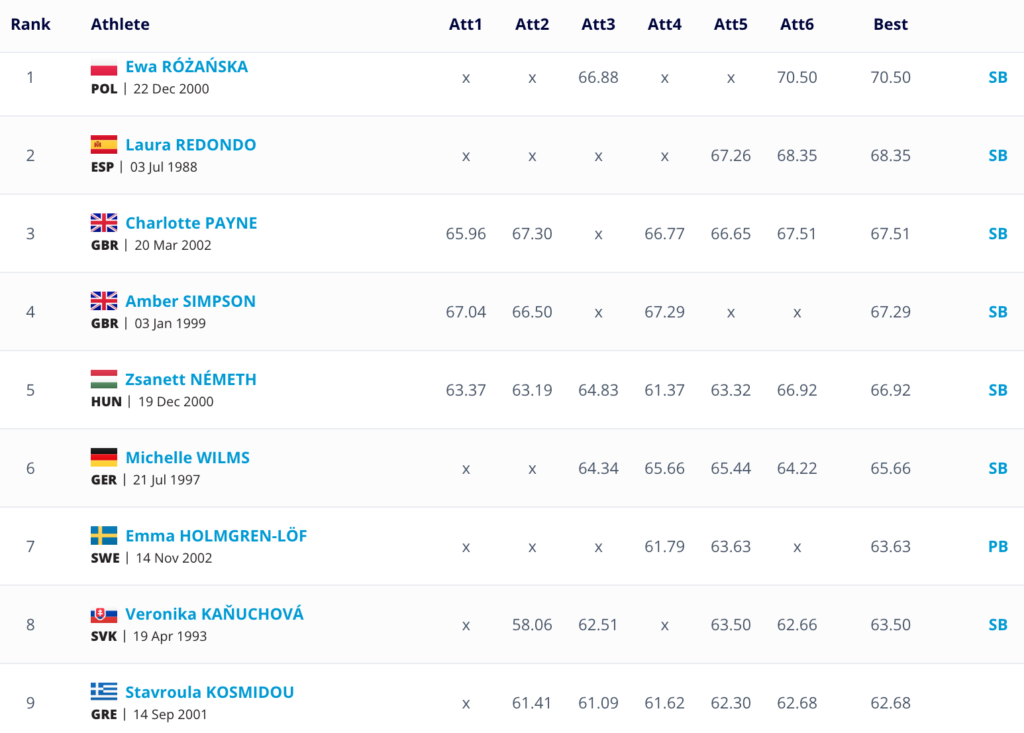 Η Κοσμίδου ήταν σταθερή στην τεχνική της με 6/6 έγκυρες βολές που μετρήθηκαν μεταξύ 61-63μ, αλλά δεν μπόρεσε να κάνει σε κάποια την υπέρβαση, πάνω από το φετινό της 63.21μ από το Ηράκλειο. Η αθλήτρια του Κώστα Κοροσίδη είχε καλύτερη βολή στα 62.68μ από την 6η της προσπάθεια και κατέκτησε την 9η θέση στο Β γκρουπ και την 21η στο σύνολο.