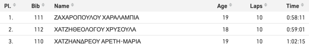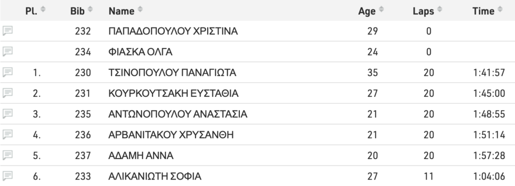 Στις γυναίκες, γρηγορότερη από όλες ήταν η Παναγιώτα Τσινοπούλου με χρόνο 1:41:57, ενώ απούσες από τον αγώνα ήταν δύο από τα φαβορί για τη νίκη, η Χριστίνα Παπαδοπούλου και η Όλγα Φιάσκα. Το αργυρό μετάλλιο πήγε στην Έφη Κουρκουτσάκη με 1:45:00, ενώ το βάθρο συμπλήρωσε η Αναστασία Αντωνοπούλου με 1:48:55. Να σημειωθεί ότι η Αντωνοπούλου έχει τρέξει σε χρόνο καλύτερο από το όριο για το Ευρωπαϊκό Κ23 στο Μπέργκεν.