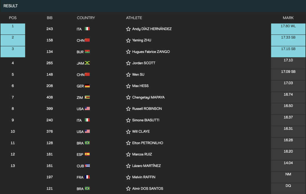 Σύμφωνα με την ανακοίνωση της World Athletics o Ντος Σάντος παραβιάσε τον κανονισμό που αφορά την επιλογή παπουτσιού και έτσι ακυρώθηκε και έχασε το χάλκινο μετάλλιο που είχε κατακτήσει λίγο νωρίτερα με το άλμα του στα 17.22μ.