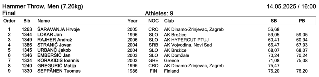 Την αυλαία για τις ελληνικές συμμετοχές στο Ζάγκρεμπ θα ανοίξει ο Γιάννης Κορακίδης στη σφυροβολία. Ο αθλητής από το Κιλκίς έχει ξεκινήσει δυναμικά τη σεζόν με το 71.08μ που του χάρισε μετά το χάλκινο μετάλλιο στην κατηγορία Κ23 στο Ευρωπαϊκό Κύπελλο ρίψεων και θα μπει στον αγώνα με την τρίτη καλύτερη επίδοση μεταξύ των συμμετεχόντων με στόχο να στείλει τη σφύρα ακόμη πιο μακριά.