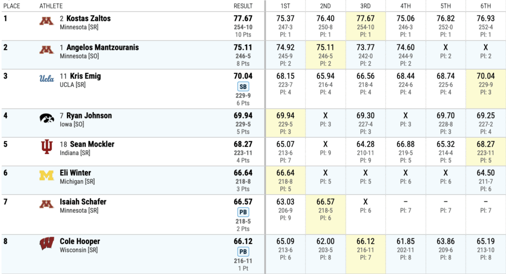 Mε καλύτερη βολή στα 77.67μ, ο Ζάλτος βελτίωσε τρεις φορές το ρεκόρ αγώνων και μάλιστα διαδοχικά με 75.37μ, 76.40μ και τέλος 77.67μ, ενώ όλες του οι βολές μετρήθηκαν πάνω από τα 75μ, αποδεικνύοντας τη σταθερότητά και την άνεση που έχει σε αυτές τις βολές. Αυτή είναι η τέταρτη φορά που ο κορυφαίος Έλληνας σφυροβόλος κερδίζει τον συγκεκριμένο αγώνα στην καριέρα του, μετά το 2021, 2022 και 2023, ενώ ο τίτλος παραμένει σε ελληνικά χέρια για πέμπτη σερί χρονιά, καθώς πέρσι νικητής είχε αναδειχθεί ο Άγγελος Μαντζουράνης, που φέτος έκανε το 1-2 για το Πανεπιστήμιο της Μινεσότα.
