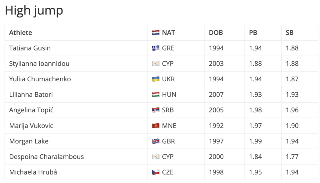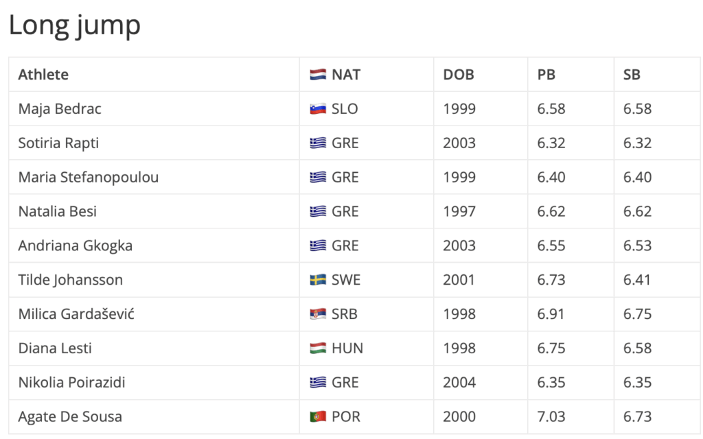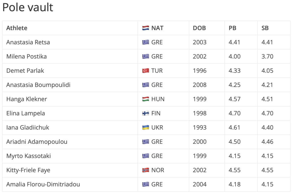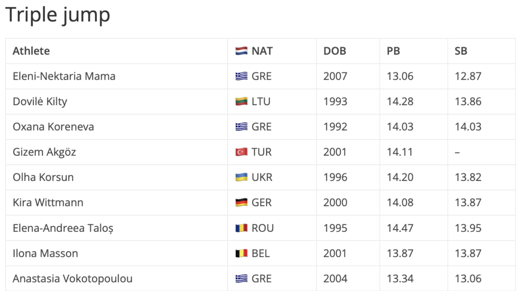 Προερχόμενη από το Αλεξανδρινό μίτινγκ, όπου σημείωσε νέο ατομικό ρεκόρ με 14.03μ, η Οξάνα Κορένεβα θα μπει στον αγώνα του τριπλούν έχοντας την καλύτερη φετινή επίδοση. Εκεί θα έρθει αντιμέτωπη με την Ρουμάνα Έλενα Αντρέα Τάλος που φέτος έχει φτάσει τα 13.95μ, αλλά έχει ατομικό ρεκόρ 14.47μ, καθώς και την Λιθουανή Ντοβίλε Κίλτι που έχει προσγειωθεί στα 13.86μ μέσα στο 2025, ενώ έχει καλύτερο άλμα στα 14.28μ. Τις ελληνικές συμμετοχές συμπληρώνουν η νεάνιδα Ελένη Μαμά και η νέα Αναστασία Βοκοτοπούλου, οι οποίες έχουν ήδη ξεπεράσει τα όρια για τα Ευρωπαϊκά Πρωταθλήματα της κατηγορίας τους σε Τάμπερε και Μπέργκεν αντίστοιχα.