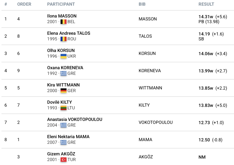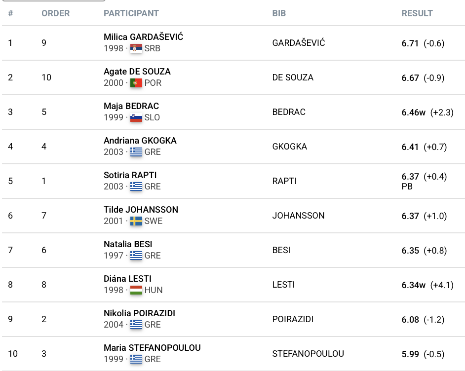 Η Σερβίδα Μίλιτσα Γκαρντάσεβιτς και η Πορτογαλέζα Αγκάτε Ντε Σούζα ξεχώρισαν με τις επιδόσεις τους, με την πρώτη ναι παίρνει τη νίκη με 6.71μ (-0.6) και τη δεύτερη να ακολουθεί με 6.67μ (-0.9). Η κορυφαία τριάδα συμπληρώθηκε από την Σλοβένα Μάγια Μπεντράκ, η οποία σημείωσε 6.46μ με άνεμο +2.3, ενώ την καλύτερη θέση στην κατάταξη από τις Ελληνίδες πήρε η Αντριάνα Γκόγκα που έφτασε τα 6.41μ (+0.7). Ακόμη, την καλύτερη επίδοση της καριέρας της πέτυχε η Σωτηρία Ράπτη που προσγειώθηκε δύο εκατοστά μακρύτερα από το όριο για το Ευρωπαϊκό Πρωτάθλημα Κ23 του Μπέργκεν (6.35μ) και πλέον έχει την ευκαιρία να διεκδικήσει τη συμμετοχή της στη διοργάνωση και στα δύο αγωνίσματα των οριζόντιων αλμάτων (μαζί με το τριπλούν).