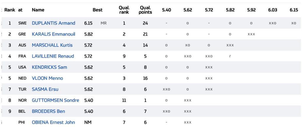 Ο Καραλής ξεκίνησε τον αγώνα του με επιτυχημένη προσπάθεια στα 5.62μ και στη συνέχεια επέλεξε να αφήσει το επόμενο ύψος του 5.72μ και να πάει απευθείας στα 5.82μ, το οποίο ξεπέρασε με την πρώτη. Έχοντας εξασφαλίσει την δεύτερη θέση με αυτό το άλμα, ο Έλληνας πρωταθλητής ολοκλήρωσε την προσπάθειά του με τρεις αποτυχημένες στα 5.92μ, ενώ η νίκη πήγε στο αδιαφιλονίκητο φαβορί, τον Σουηδό Μόντο Ντουπλάντις που βελτίωσε δύο φορές το δικό του ρεκόρ αγώνων αρχικά με 6.03μ και αργότερα με 6.15μ. Ο παγκόσμιος ρέκορντμαν δεν συνέχισε σε μεγαλύτερο ύψος και αποχαιρέτησε το κοινό χωρίς να δοκιμάσει να καταρρίψει το δικό του παγκόσμιο ρεκόρ του 6.27μ.