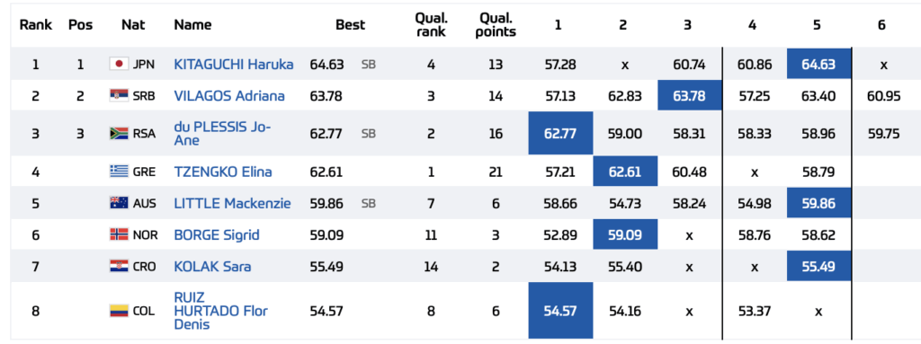 Η Ελίνα Τζένγκο μπορεί να μην κατάφερε να συνεχίσει το αήττητο σερί της από τους προηγούμενους αγώνες, αλλά έδειξε σταθερότητα στις καλές επιδόσεις, στέλνοντας το ακόντιο στα 62.61μ. Η Ελληνίδα πρωταθλήτρια σημείωσε διαδοχικά 57.21μ, 62.61μ, 60.48μ, Χ, 58.79μ και στάθηκε ελαφρώς άτυχη, καθώς στην πέμπτη βολή την ξεπέρασε η νικήτρια του αγώνα, Χαρούκα Κιταγκούτσι, η οποία την έθεσε οριστικά εκτός της κορυφαίας τριάδας και της στέρησε το δικαίωμα να επιχειρήσει την έκτη και τελευταία της βολή. Η ρίπτρια από την Ιαπωνία κατέκτησε την κορυφή με 64.63μ, επίδοση κοντά στις δυνατότητες της Τζένγκο, ενώ το βάθρο συμπλήρωσαν η Σερβίδα Αντριάνα Βιλάγκος και η Νοτιοαφρικανή Τζοάν ντου Πλέσις με 63.78μ και 62.77μ.