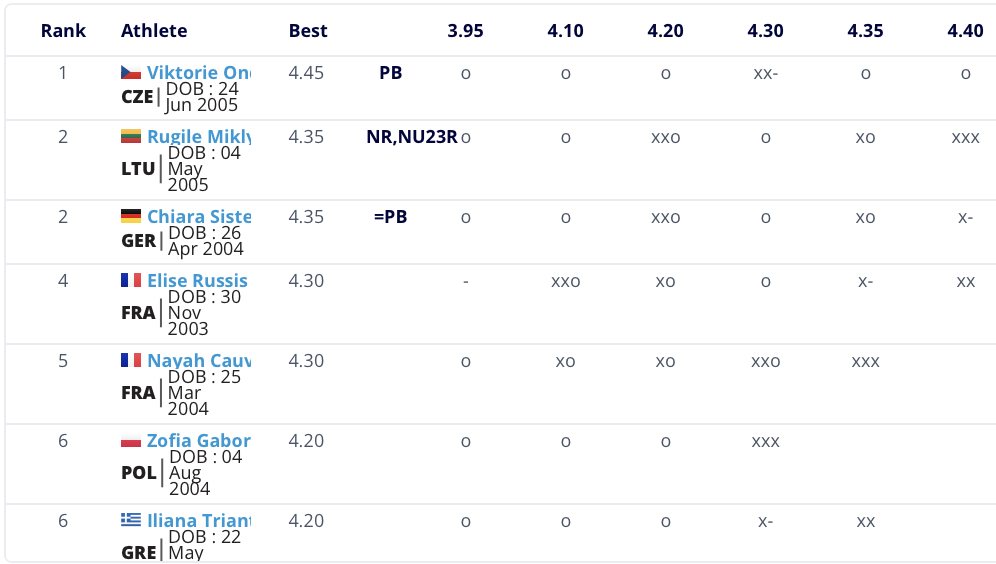 Την νίκη πήρε η Τσέχα Βίκτορι Οντρόβα με 4.45μ, ενώ στην κατάταξη ακολούθησαν η Λιθουανή Ρουγκίλε Μικλικιούτε με 4.35μ και νέο εθνικό ρεκόρ, καθώς και η Γερμανίδα Κιάρα Σίστερμαν με την ίδια επίδοση, οι οποίες θα ανέβουν μαζί στο δεύτερο σκαλί του βάθρου.