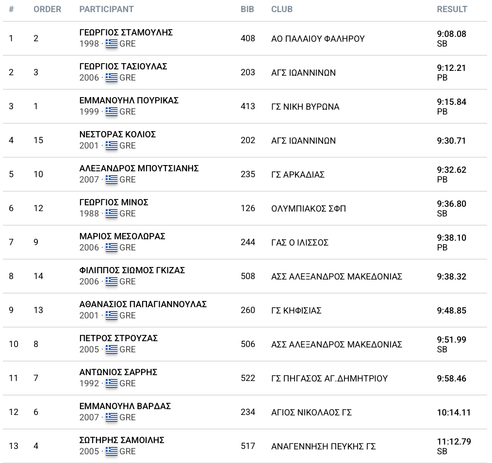 Στους άνδρες ο Γιώργος Σταμούλης επέστρεψε στην κορυφή μετά το 2022 κόβοντας το νήμα του τερματισμού σε 9:08.08 με τους Γιώργο Τασιούλα και Εμμανουήλ Πουρίκα να ακολουθούν σε 9:12.21 και 9:15.84.