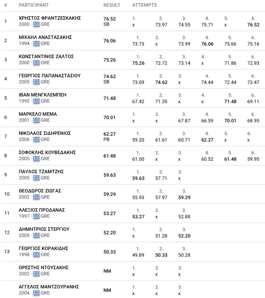 Μέχρι την πέμπτη βολή ο Φραντζεσκάκης βρισκόταν στην δεύτερη θέση της αναμέτρησης με καλύτερη βολή στα 75.71μ και στην έκτη βολή μπήκε αποφασισμένος και έκανε την ανατροπή με 76.52μ, σημειώνοντας νέο φετινό ρεκόρ μετά το 76.08μ που είχε από το Χειμερινό Κύπελλο ρίψεων του Μαρτίου. Δεύτερος ήρθε ο Μιχάλης Αναστασάκης με 76.06μ, πολύ κοντά στο φετινό του 76.09μ , ενώ η τρίτη θέση πήγε στον Κώστα Ζάλτο με 75.26μ. Εντυπωσιακός ήταν ακόμη ο δευτεραθλητής Ευρώπης στο Μπέργκεν Γιώργος Παπαναστασίου με 74.62μ, ενώ ο κορυφαίος Έλληνας φέτος, ο Άγγελος Μαντζουράνης έμεινε εκτός καταταξης με τρεις άκυρες όπως ακριβώς και στο Ευρωπαϊκό Κ23.