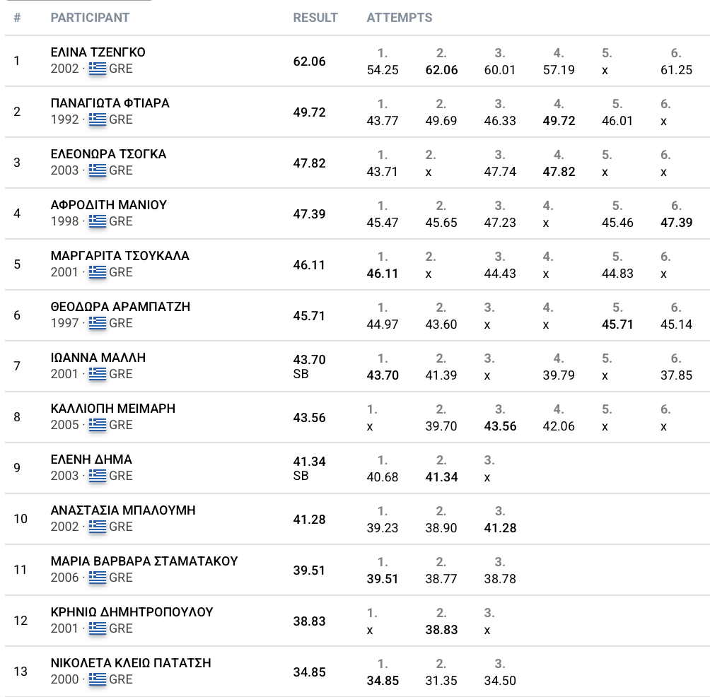 Η Ελίνα Τζένγκο πήρε την έκτη σερί νίκη της σε Πανελλήνιο Πρωτάθλημα δείχνοντας σταθερή σε μεγάλες βολές κοντά στα 62μ. Συγκεκριμένα, η καλύτερη βολή της μετρήθηκε στα 62.06μ και η ίδια φάνηκε πως διατηρεί μια σταθερά ανοδική πορεία ενόψει του Παγκοσμίου Πρωταθλήματος. Η Παναγιώτα Φτιαρά πήρε το αργυρό μετάλλιο με 49.72μ, ενώ τρίτη ήρθε η νέα Ελεονώρα Τσόγκα με 47.82μ.