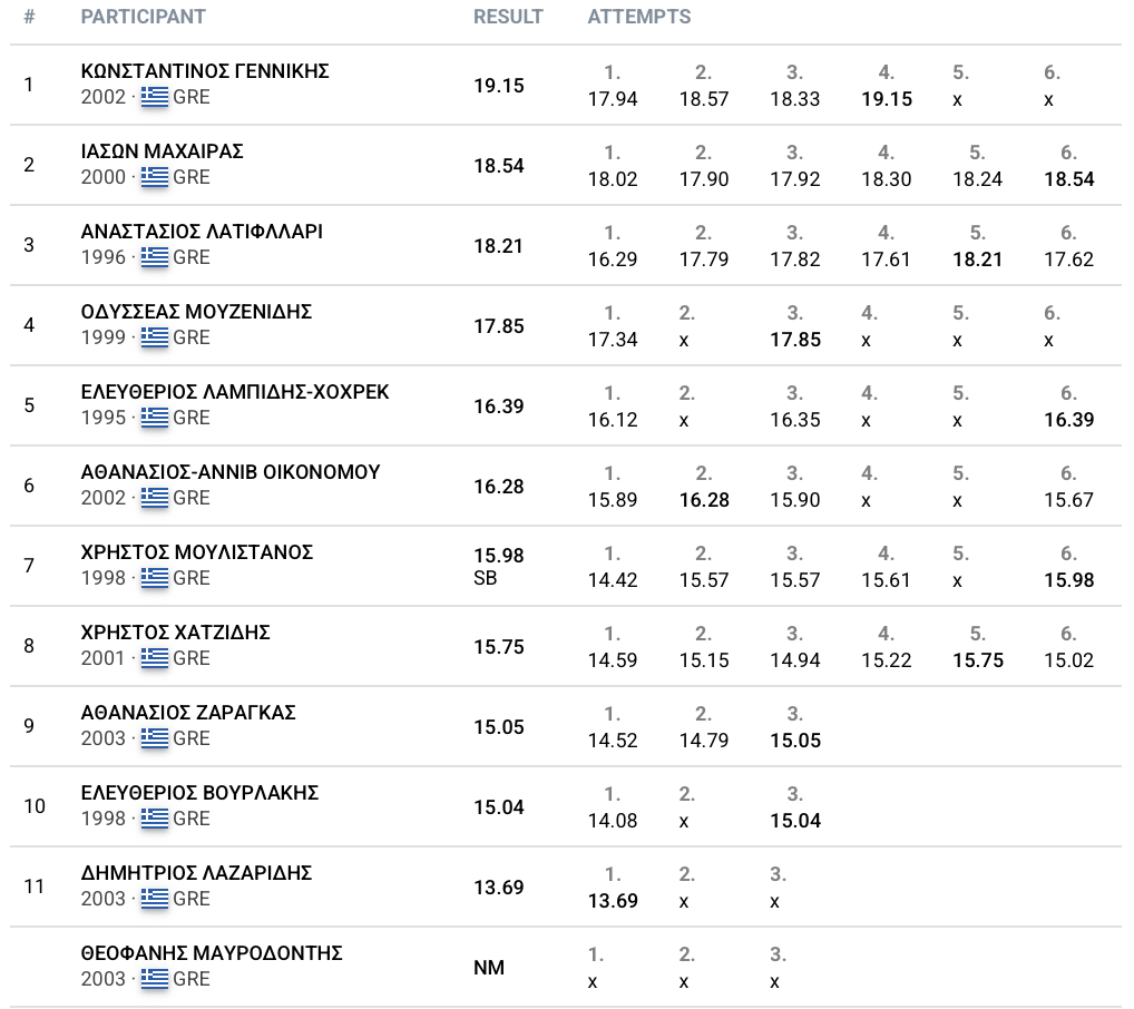 Ο Κώστας Γεννίκης έγραψε ξανά 19μ μπροστά, όπως ακριβώς και την περασμένη εβδομάδα και με 19.15μ κατέκτησε με διαφορά την κορυφή της κατάταξης με 19.15μ και τον δεύτερο Ιάσονα Μαχαίρα να έχει καλύτερη βολή στα 18.54μ. Το βάθρο των νικητών συμπλήρωσε ο Τάσος Λατιφλάρι με 18.21μ, ενώ άτυχος ήταν ο Φάνης Μαυροδόντης που έμεινε εκτός αγώνα με τρεις άκυρες προσπάθειες.