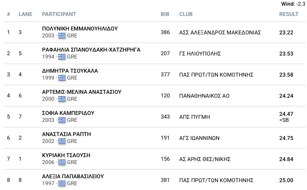 Η Πολυνίκη Εμμανουηλίδου απέδειξε πως πρόκειται για την γρηγορότερη Ελληνίδα σπρίντερ τη δεδομένη στιγμή, κόβοντας το νήμα του τερματισμού σε 23.22(-2.3). Η χάλκινη στο Ευρωπαϊκό Πρωτάθλημα Κ23 πριν μερικές εβδομάδες πήρε τη νίκη και στα 200μ μετά τα 100μ και πλέον εστιάζει την προσοχή της στην ξεκούραση με στόχο το Παγκόσμιο Πρωτάθλημα του Τόκιο. Η Ραφαέλα Σπανουδάκη που το πρωί ήταν η ταχύτερη στον προκριματικό τερμάτισε στη δεύτερη θέση με 23.53, ενώ τρίτη ήταν η Δήμητρα Τσουκαλά με 23.58.