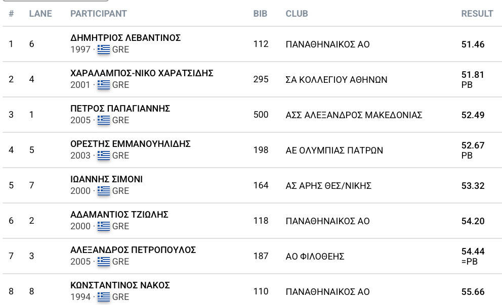 Ο Δημήτρης Λεβαντίνος υπερασπίστηκε μεν τον τίτλο του στα 400μ εμπόδια με μια μέτρια εμφάνιση δε, που όμως ήταν αρκετή να για να του χαρίσει το χρυσό. Ο Λεβαντίνος πήρε την τρίτη σερί νίκη του στο αγώνισμα με 51.46 και άφησε στην δεύτερη θέση τον Χαράλαμπο Χαρατσίδη που τον κόντραρε στα ίσα με 51.81. Τρίτος ήταν ο Πέτρος Παπαγιάννης με 52.49.