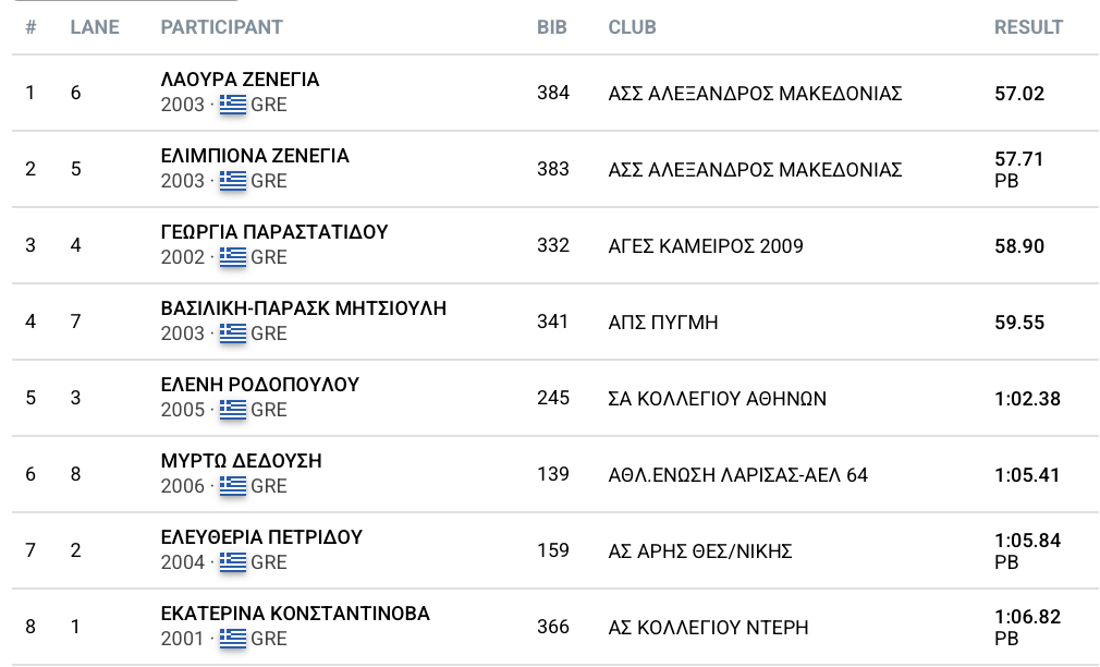 Οι αδερφές Ζενέγια ήταν σαν να έπαιξαν σε replay την κούρσα του Βαλκανικού, αφού κατάφεραν να κάνουν ξανά το 1-2, με την Λάουρα να αναδεικνύεται εκ νέου νικητρια και μάλιστα με την ίδια επίδοση (57.02) και την Έλλη να σημειώνει ξανά νέο ατομικό ρεκόρ, με χρόνο 0.2 κάτω από το 57.91 του Βαλκανικού. Το βάθρο συμπληρώθηκε από την Γεωργία Παραστατίδου με 58.90.