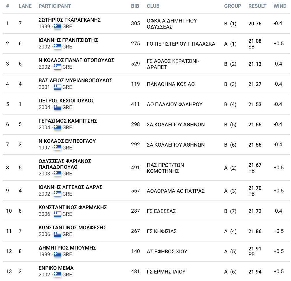Μετά τη νίκη στα 100μ, ο Σωτήρης Γκαραγκάνης ήταν νικητής και στα 200μ με χρόνο 20.76(-0.4) και πέτυχε το πρώτο νταμπλ στην καριέρα του σε Πανελλήνιο Πρωτάθλημα ανοιχτού. Ο ίδιος υπερασπίστηκε τον τίτλο του από πέρσι και πέρασε την γραμμή του τερματισμού γρηγορότερα από τον Γιάννη Γρανιτσιώτη, που πήρε τη δεύτερη θέση από την αργή σειρά με 21.08 και τον Νίκο Παναγιωτόπουλο που πήρε το χάλκινο με 21.13, αφήνοντας στην τέταρτη θέση τον Μυριανθόπουλο με 21.27.