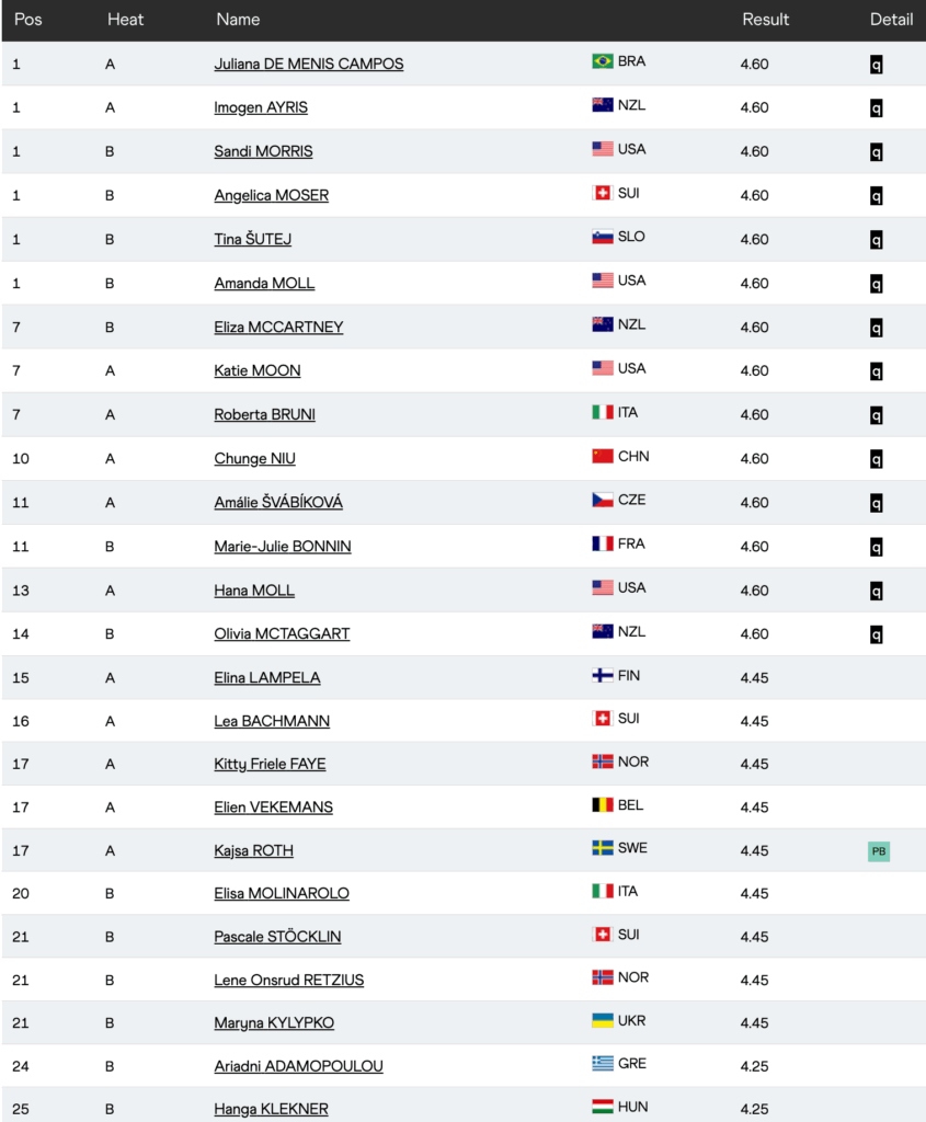 Η Αδαμοπούλου δεν βρέθηκε σε καλή μέρα και υπερέβη μόνο το αρχικό ύψος του 4.25μ, το οποίο απέχει από το φετινό της 4.46μ. Η αθλήτρια του Βασίλη Μεγαλοοικονόμου στη συνέχεια είχε τρία άκυρα άλματα στο 4.40μ. Ακόμη και να πλησίαζε περισσότερο είτε το φετινό είτε το ατομικό της ρεκόρ (4.50μ), η υπέρβαση θα ήταν απαραίτητη για την πρόκριση στον τελικό, αφού η 12άδα έκλεισε στα 4.60μ. Σαφώς, η 24η θέση δεν είναι αντιπροσωπευτική για την ίδια, αλλά μια συμμετοχή σε Παγκόσμιο Πρωτάθλημα μόνο ευνοϊκά μπορεί να λειτουργήσει για την 25χρονη που πέρυσι αγωνίστηκε στους πρώτους Ολυμπιακούς Αγώνες της καριέρας της στο Παρίσι.