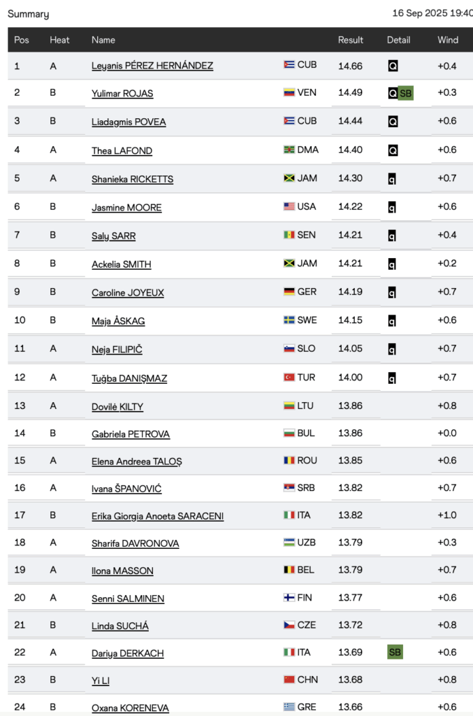Ένα άλμα κοντά στο ατομικό της ρεκόρ (14.03μ) θα μπορούσε να εξασφαλίσει στην Ελληνίδα την πρόκριση, αφού η 12η αθλήτρια που πήρε την πρόκριση για τον τελικό είχε καλύτερο άλμα στα 14.00μ. Ωστόσο, η Κορένεβα έμεινε σχετικά χαμηλά για τα δεδομένα της με αποτέλεσμα να κατακτήσει την 24η θέση χάρη στο 13.66 (+0.6) της δεύτερης προσπάθειας. Tα υπόλοιπα δύο άλματα της μετρήθηκαν στα 13.50μ και 13.61μ, ενώ την κορυφαία επίδοση κατέγραψε η Κουβανή Λεγιανίς Πέρεζ Χερνάντεζ με 14.66μ.