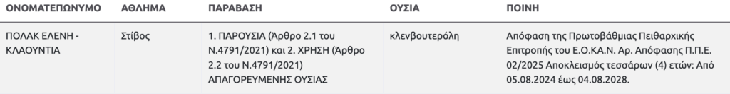 Σύμφωνα με την ανακοίνωση του ΕΟΚΑΝ που δημοσιεύτηκε πάνω από 10 μήνες μετά το Παρίσι, η Ελένη Πόλακ τιμωρήθηκε με τετραετή ποινή για παρουσία και χρήση της ουσίας κλενβουτερόλη, που χρησιμοποιήθηκε αρχικά για την αντιμετώπιση του άσθματος και σε μεγάλες ποσότητες φέρεται να έχει συσχέτιση με την αύξηση της μυϊκής μάζας ή/και το αδυνάτισμα.