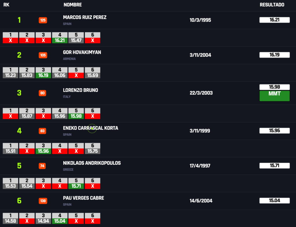 Ο Νίκος Ανδρικόπουλος άνοιξε τις ελληνικές εμφανίσεις στον αγώνα του τριπλούν ανδρών και κατέκτησε την 5η θέση με καλύτερο άλμα στα 15.71μ από την 5η του προσπάθεια. Είχε δύο πρώτα άλματα στο 15.53μ και 15.54μ και τρία άκυρα. Καλύτερος όλων ο Ισπανός Μάρκος Ρουίθ Πέρεθ με 16.21μ.