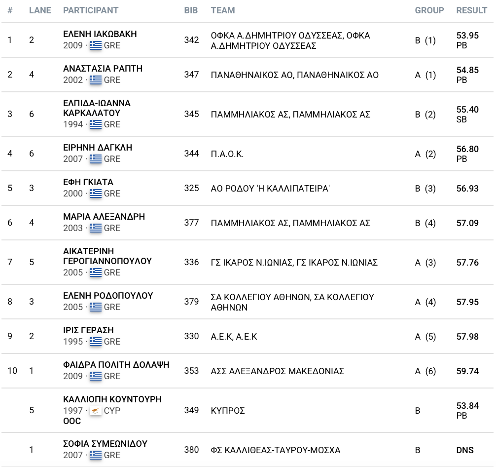 Ο παραπάνω χρόνος ήταν φυσικά υπεραρκετός για να της χαρίσει τον τίτλο, αφού η δεύτερη, Αναστασία Ράπτη τερμάτισε σε 54.85, ενώ σημαντικό ρόλο στην κούρσα έπαιξε και η Κύπρια Καλλιόπη Κουντούρη (53.84), δίνοντας ρυθμό στην Ιακωβάκη.