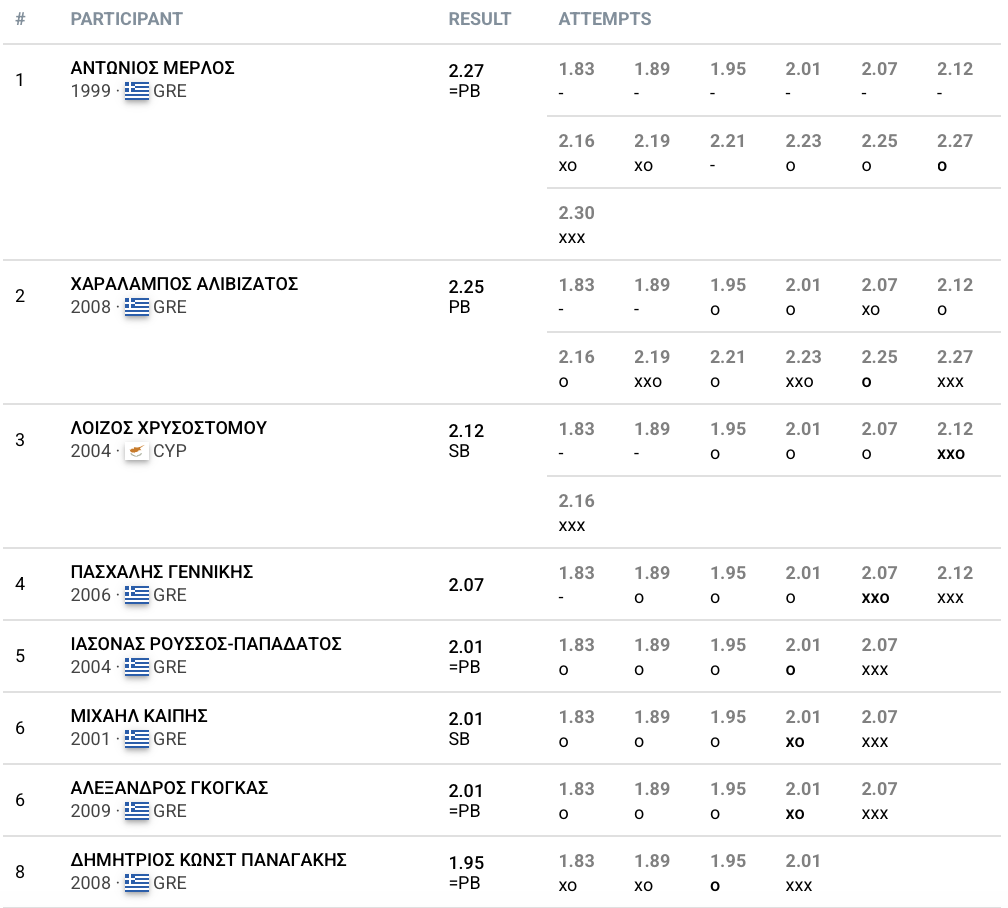 Εξίσου εντυπωσιακά άλματα σημειώθηκαν και από τον νικητή Αντώνη Μέρλο, ο οποίος επιβεβαίωσε ότι τα ψηλά άλματα είναι πλέον μια ρουτίνα που ήρθε εδώ για να μείνει με ένα καθαρό άλμα στα 2.27μ. Να σημειωθεί ότι η νικητήρια επίδοση του Μέρλου είναι η κορυφαία των τελευταίων δέκα χρόνων.