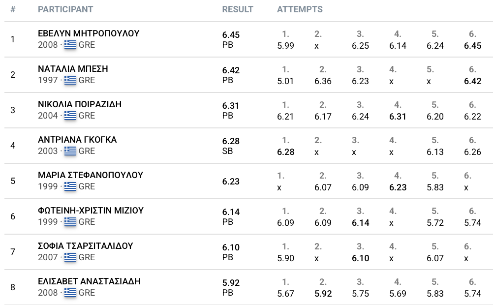 Βέβαια, στην τελευταία της προσπάθεια η Μπεση έφτασε σε απόσταση αναπνοής από την ανατροπή με 6.42μ, αλλά αυτό δεν ήταν αρκετό για τη νίκη και έτσι έφυγε με το αργυρό μετάλλιο. Το βάθρο συμπληρώθηκε από την Νικολία Ποιραζίδη με άλμα στα 6.31μ.