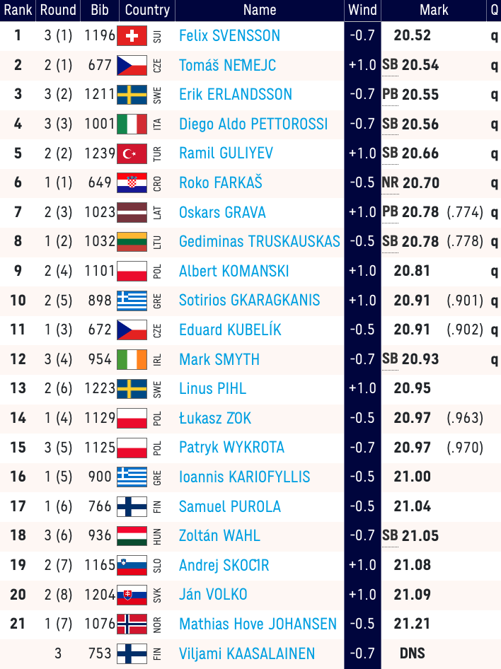 Ο Σωτήρης Γκαραγκάνης τερμάτισε την κούρσα του σε χρόνο 20.91 (+1.0), βρισκόμενος μόλις 5 εκατοστά μακριά από το φετινό του ρεκόρ και κατέλαβε την 5η θέση στην δεύτερη προκριματική σειρά. Κατέκτησε τη 10η η θέση στη συνολική κατάταξη και πήρε ένα από τα 12 εισιτήρια για τον απογευματινό ημιτελικό. Από την άλλη, ο Γιάννης Καριοφύλλης τερμάτισε στην 5η θέση της πρώτης προκριματικής σειράς των 200μ με χρόνο 21.00 (-0.5). Έμεινε 16ος στον προκριματικό και έτσι φεύγει από τη Ρώμη με την 28η θέση στην τελική κατάταξη.