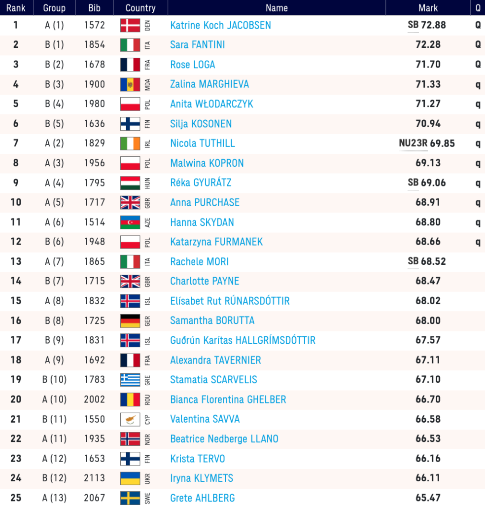 Η Σταματία Σκαρβέλη στη σφυροβολία κατάφερε να ρίξει καλύτερα στην τριτή και τελευταία της βολή, η οποία μετρήθηκε στα 67.10μ. Με αυτή την επίδοση η Σκαρβέλη κατέλαβε τη 10η θέση στο γκρουπ της και τη 19η στο σύνολο, ενώ η δωδεκάδα έκλεισε στα 68.66μ.