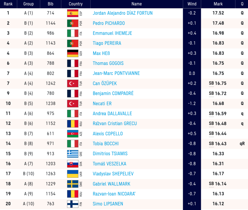 Ο Τομπία Μπόκι, ο τρίτος καλύτερος Ιταλός του προκριματικού, κατέκτησε την 14η επίδοση στη συνδυαστική κατάταξη και από τα δύο γκρουπ με 16.43μ (-0.8) από το δεύτερό του άλμα. Είχε ένα τελευταίο άλμα για να εξασφαλίσει την πρόκριση στον τελικό, την οποία μέχρι τότε δεν εξασφάλιζε με το 16.43μ. Σύμφωνα με την επίσημη ενημέρωση που έδωσε η FIDAL, το σύστημα μέτρησης των διοργανωτών παρουσίασε ένα πρόβλημα μετά το άλμα του αμέσως προηγούμενου αθλητή, του Γάλλου Μπέντζαμιν Κομπαορέ, με αποτέλεσμα να υπάρχει καθυστέρηση της τάξης των 20 λεπτών για την εκτέλεση του τελευταίου του άλματος.