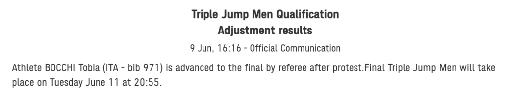 Ο Μπόκι ήταν ο τελευταίος αθλητής που είχε απομείνει με διαθέσιμο άλμα και από τα δύο γκρουπ, και στόχος του ήταν να ξεπεράσει το 16.48μ που είχε ο 12ος της συνδυαστικής κατάταξης, ο Ρουμάνος Γκρέκου. Ο Μπόκι προσγειώθηκε στο 16.27μ (0.2) και παρέμεινε 14ος, με τον 13ο Αλέξις Κοπέλο (Αζερμπαϊτζάν) επίσης εκτός τελικού. Η ιταλική ομοσπονδία όμως στη συνέχεια προχώρησε σε ένσταση, με τη λογική ότι η καθυστέρηση των 20 λεπτών επηρέασε την απόδοση του αθλητή στο τελευταίο άλμα.Όλως περιέργως η ένσταση έγινε δεκτή και ο Μπόκι έγινε ο… 13ος αθλητής στην 12άδα του τελικού, ακολουθώντας τους άλλους δύο Ιταλούς, Ιεμέτζε και Νταλαβάλε. Η ένδειξη που δόθηκε στα αποτελέσματα ήταν qR (advanced to the next round by referee) δηλαδή “προκρίνεται στον επόμενο γύρο με απόφαση κριτή”.