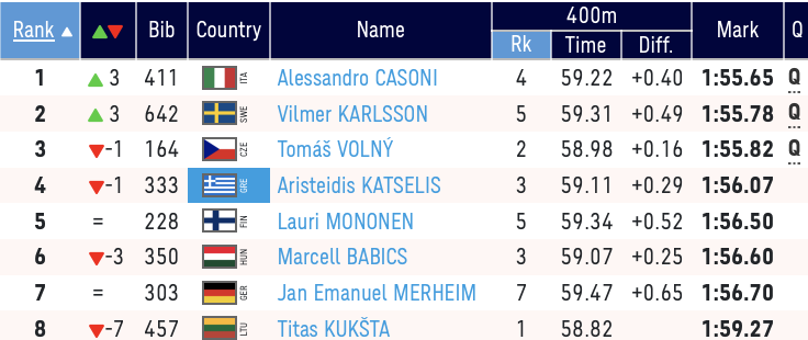 Ο Σαλπάς δήλωσε στο athlead.gr: «Ήταν μια δύσκολη κούρσα. Μεγάλος ανταγωνισμός, και γι’ αυτό είμαι χαρούμενος. Επειδή είμαι ένας από αυτούς. Στο μυαλό μου είχα να είμαι μέσα στους 3 πρώτους, αλλά δεν βγήκε πολύ. Μάλιστα πήγα να πέσω σε μια στροφή, αλλά στο τέλος βρήκα την ισορροπία μου και έγινε ότι έγινε. Στον ημιτελικό θέλω ένα ατομικό ρεκόρ», ενώ ο Κατσέλης είπε: «Ήταν κάτι πολύ διαφορετικό αλλά ωραίο. Θα ήθελα μια καλύτερη επίδοση, αλλά δεν πειράζει. Νομίζω ξεχάστηκα σε ένα σημείο και έχασα το πέρασμα. Ένιωθα καλά, μπορούσα να πάω και πιο κάτω. Κρατάω την εμπειρία κια το ότι μπόρεσα να τρέξω δίπλα σε τέτοιους αθλητές».