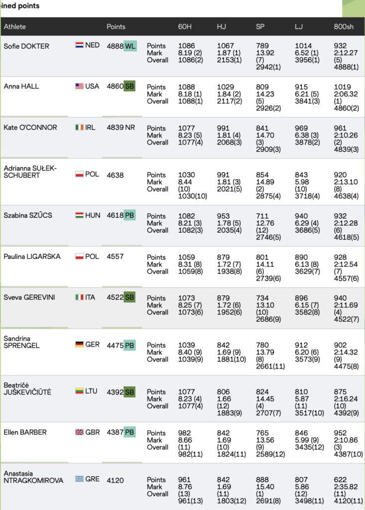 Η αθλήτρια του Γιώργου Μποτσκαριώβ έμεινε κοντά στα 6μ στο μήκος με καλύτερο άλμα στα 5.86μ που πρόσθεσε 807β στην συγκομιδή της και ολοκλήρωσε δίνοντας όλη της την ψυχή στο 800άρι, το αδύναμό της αγώνισμα, με νέο μεγάλο ατομικό ρεκόρ. Το χρονόμετρο έδειξε 2:35.82, επίδοση σχεδόν τρία δευτερόλεπτα καλύτερη από το 2:38.98 που είχε μέχρι πρότινος.