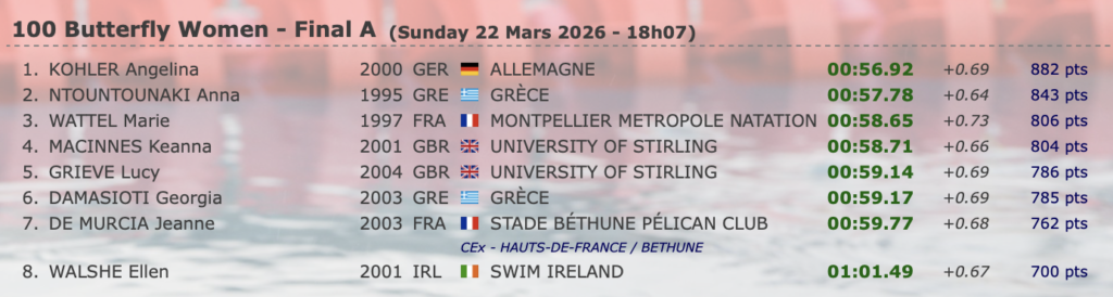 Η Άννα Ντουντουνάκη στο βασικό της αγώνισμα, τα 100μ πεταλούδα, κατέβηκε τα 58 δευτερόλεπτα για πρώτη φορά φέτος με 57.78 και έχασε μόνο από την Γερμανίδα Ανγκελίνα Κόλερ που κατέβηκε και τα 57 δευτερόλεπτα με 56.92. Το βάθρο συμπλήρωσε η Γαλλίδα Μαρί Βατέλ με 58.65. Στην ίδια κούρσα η Γεωργία Δαμασιώτη ήταν 6η με χρόνο 59.17.
