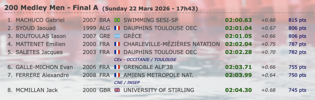 Πολύ κοντά στο ατομικό του έφτασε ο Ιάσονας Ρούτουλας, ο οποίος με 2:01.05, τη δεύτερη καλύτερη επίδοση της καριέρας του πίσω από το 2:00.30, κατέκτησε το χάλκινο μετάλλιο. Πιο γρήγορα κολύμπησαν ο Βραζιλιάνος Γκάμπριελ Ματσούκο και ο Γάλλος Τζαουάντ Σιούν με 2:00.63 και 2:01.04 αντίστοιχα.