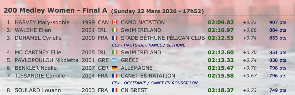 Μία ανάσα από το δικό της πανελλήνιο ρεκόρ στο ίδιο αγώνισμα έφτασε η Νικόλ Παυλοπούλου με το 2:13.32 που σημείωσε και της έδωσε την 6η θέση. Το πανελλήνιο ρεκόρ του 2:13.29 το είχε θέσει στο Παγκόσμιο 50άρας στη Σιγκαπούρη το 2025. μακριά από το δικό της πανελλήνιο ρεκορ. Η Μέρο Σόφι Χάρβεϊ (Καναδάς) ήταν η νικήτρια με 2:09.82, ενώ το βάθρο έκλεισε στο 2:12.53.
