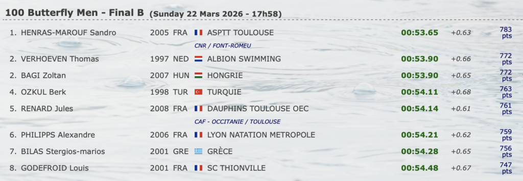 Σε ένα αγώνισμα που δεν συνηθίσει να πέφτει, ο Στέργιος Μπίλας έδειξε σε καλή κατάσταση. Ο αθλητής του κλιμακίου είχε να κατέβει από το 2023 το φράγμα των 54” στα 100μ πεταλούδα, το κατάφερε όμως στο Παρίσι με 53.99 και κατέκτησε την έβδομη θέση και την 15η στο σβολο.