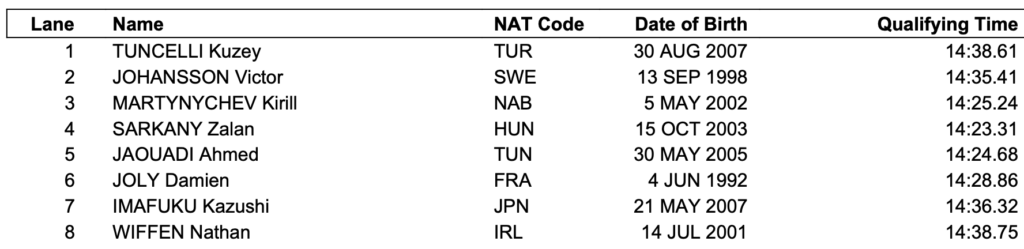 Οι οκτώ απογευματινοί έχουν πλέον… σκονάκι για το χρόνο που θα πρέπει να πετύχουν για το χρυσό. Μετά το απίστευτο 14:17.27 , που αποτελεί την καλύτερη επίδοση φέτος στον κόσμο, από τον Γερμανό Φλόριαν Βέλμπροκ στις πρωινές αργές σειρές, οι 8 αθλητές της γρήγορης σειράς θα βάλουν τα δυνατά τους για να τον ξεπεράσουν. Να σημειωθεί ότι το 4:17.27 θα έδινε το αργυρό στη Μελβούρνη το 2022, πίσω από το 4:166.88 του τεράστιου Ιταλού Γκρεγκόριο Παλτρινιέρι, ο οποίος όμως λείπει από τη Βουδαπέστη.