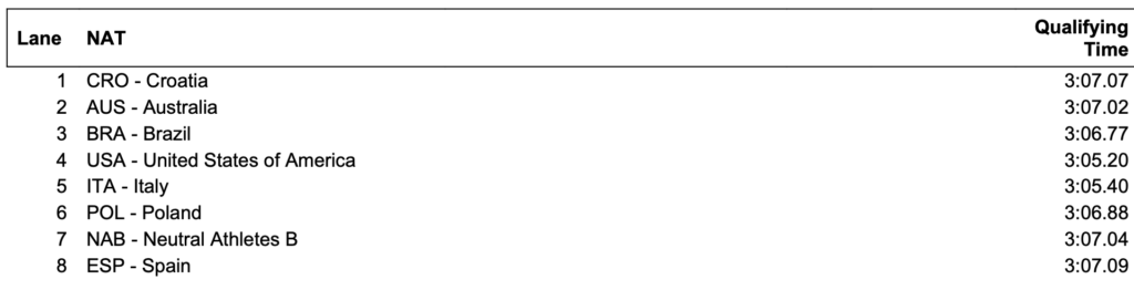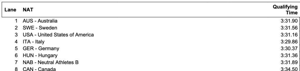 Η Ιταλία που προκρίθηκε στον τελικό με τον δεύτερο καλύτερο χρόνο θα προσπαθήσει να πάρει τον δεύτερο σερί τίτλο της στο αγώνισμα. Ο ανταγωνισμός θα είναι μεγάλος, με την ομάδα των ΗΠΑ και της Αυστραλίας – των υπόλοιπων μεταλλιούχων του 2022 – στους δίπλα διαδρόμους και γι αυτόν τον λόγο η κούρσα αναμένεται συναρπαστική. Να θυμήσουμε ότι στη Μελβούρνη η ομάδα της Ιταλίας είχε πετύχει και το τωρινό παγκόσμιο ρεκόρ με 3:02.75.