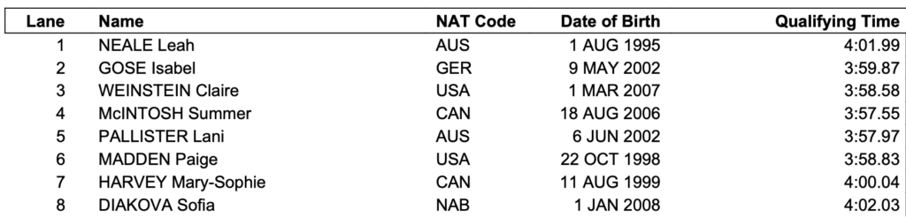 Η Καναδέζα Mάκιντος και η Αυστραλή Πάλιστερ κολύμπησαν πιο γρήγορα από όλες στα πρωινά προκριματικά, και ήταν οι μόνες που ακούμπησαν τον τοίχο σε λιγότερο από 3:58. Η Πάλιστερ θα μπει στην κούρσα με στόχο να υπερασπιστεί τον τίτλο της από την Μελβούρνη, ενώ η 18χρονη Μάκιντος, πέρα από την διεκδίκηση του τίτλου, έχει τις δυνατότητες να κυνηγησει ακόμη και το παγκόσμιο ρεκόρ στο αγώνισμα. Απούσες θα είναι η «ασημένια» και η «χάλκινη» το 2022 Έρικα Φέργουέδερ (Νέα Ζηλανδία), και Λία Σμίθ (ΗΠΑ).